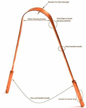 The product is made of superior quality copper that is of surgical grade.It clinically removes plaque,fungi,dead cells and bacteria from the tongue's surface,hence it is a perfect tool for tongue scraping for maintaining oral hygiene.It effectively restores our taste sensation by cleaning the taste buds and prevents the cause of bad breath.The plaque is formed mainly during sleep , when our digestion process remains active and deposits toxins and wastes onto the surface of the tongue.And if this plaque is not cleaned,it gets accumulated and reabsorbed by the body.This will lead to reduced immunity, digestive problems,affects the respiratory system severely. So this Tongue cleaner is best suited for easy yet effective tongue scraping and helps us to prevent the above problems.It has contoured handles and no synthetic material is used(Copper).It has comfortable grip and can be handled easily. The shape of tongue cleaner is non-gagging and it slides gently over our tongue.With its non-porous finishing the tongue cleaner prevents the accumulation of organic material on the surface.It has optimal length, this helps us to reach all the areas of the tongue effectively.