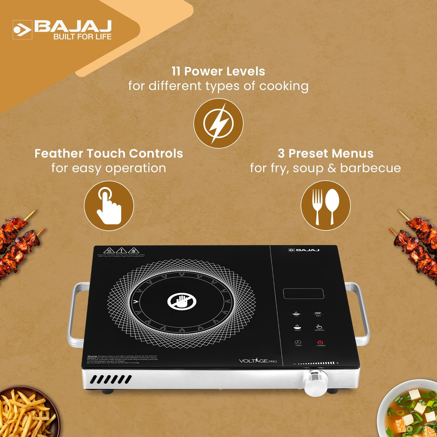Bajaj IRX 220F Infrared Induction Cooktop | 2200 Watts | 11 Power Level | 3 Preset Menu | Feather Touch Controls | Digital display |